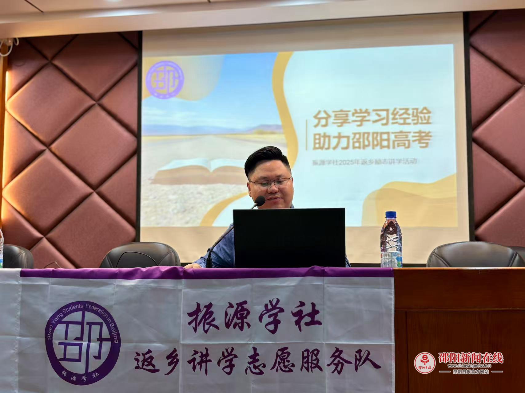 活动伊始,讲学团领队钟濠洋登台发言。作为中国政法大学本硕毕业的优秀律师,同时也是此次活动发起组织——根源学社的成员,钟濠洋向同学们介绍了根源学社的成立初衷与发展历程。他提到,根源学社由邵阳籍高校学子组建,多年来始终秉持 “反哺家乡教育,助力学子成长” 的理念,通过整合名校学子资源,搭建起中学与高校间的经验传递桥梁,已成功开展多场学习分享活动,帮助众多家乡学子明晰学习方向。