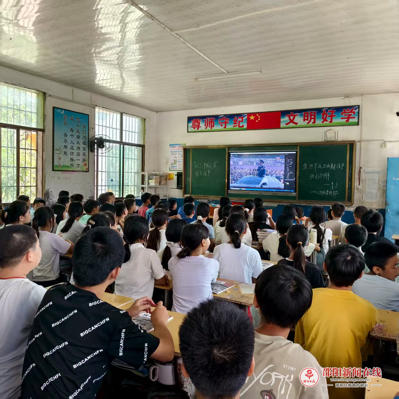 邵阳日报·邵阳新闻在线讯(通讯员 朱佳璐)9月3日,武冈市秦桥镇中学组织全体教师同步观看纪念中国人民抗日战争暨世界反法西斯战争胜利80周年大会直播。