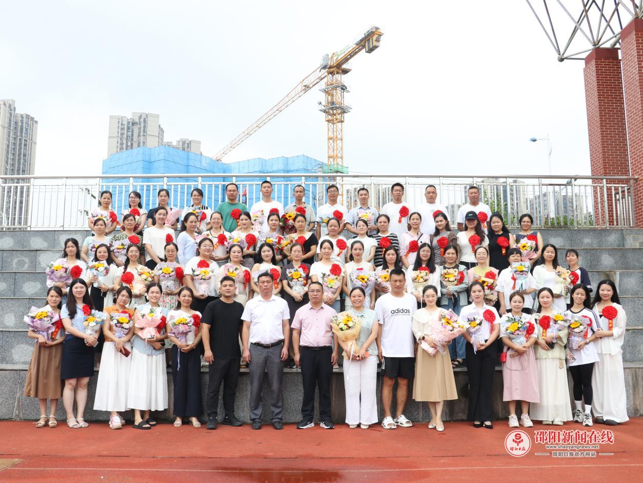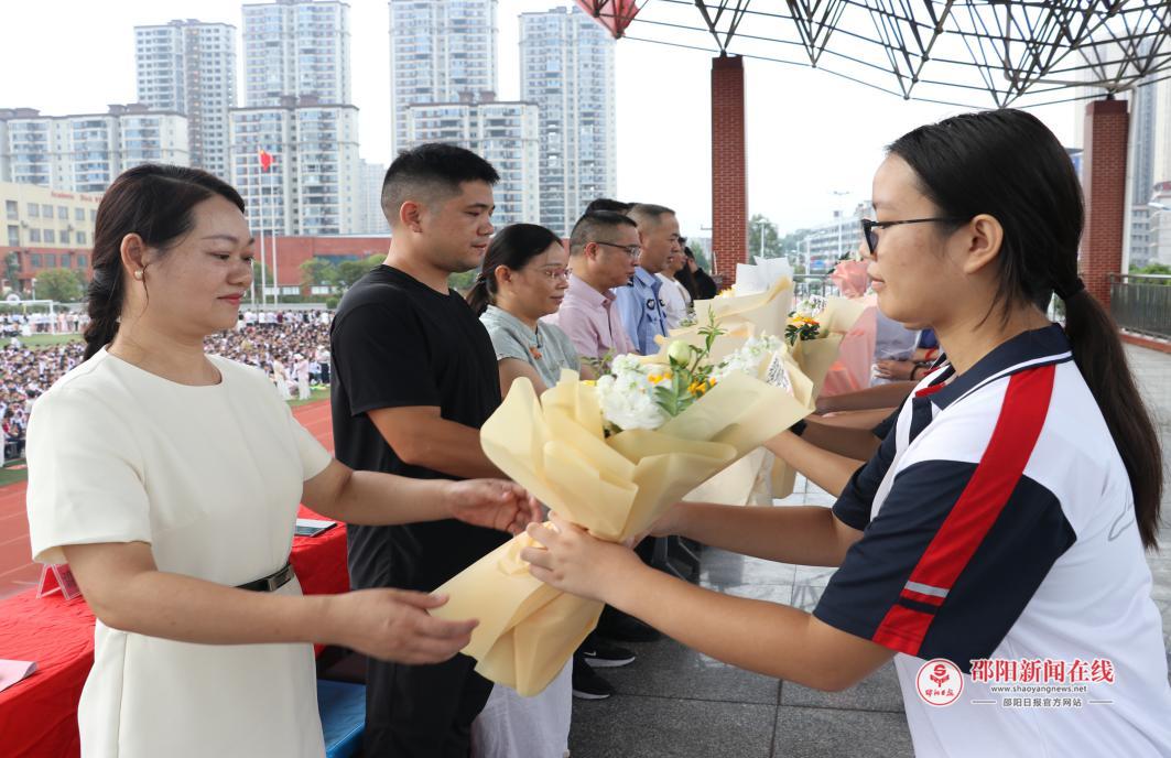 时值第 41 个教师节,典礼设置献花环节。学生代表向老师们献花、鞠躬,道一声 “老师,您辛苦了!” 现场洋溢着尊师情谊。