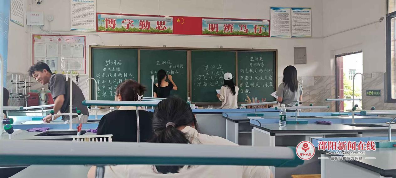 在粉笔字比赛现场,尹耀武老师在赛场上,于黑板上挥写古诗《望洞庭》。其握笔稳健,运笔流畅,笔画或刚劲有力,或灵动飘逸,将粉笔字的方正与韵味展现得淋漓尽致。每一笔、每一划都凝聚着他们对汉字书写的严谨态度,也彰显了日常教学中对板书艺术的重视。