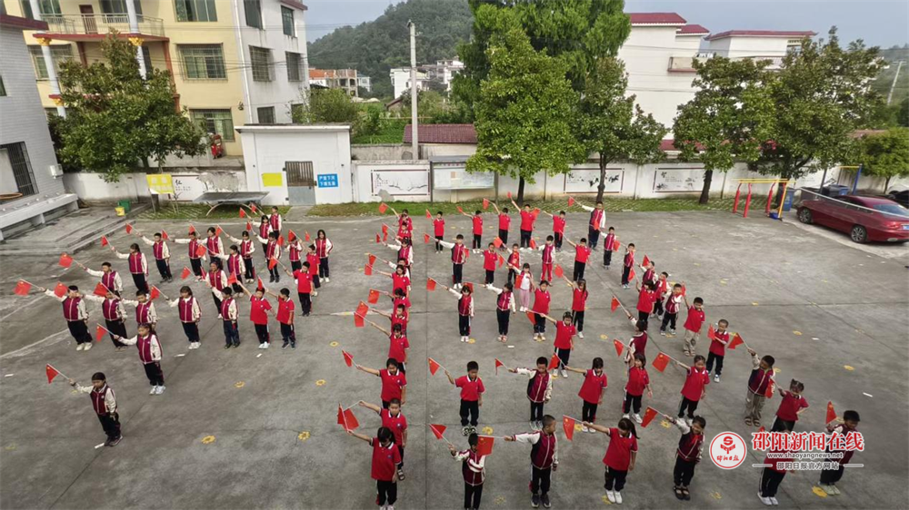 邵阳日报·邵阳新闻在线讯(通讯员 王巧云 刘稘维)9月28日上午,洞口县竹市镇山脚完小操场化作赤诚的爱国画卷。在庄严的升旗仪式后,该校师生通过精准走位,在操场上拼出“中国”字样。76面小红旗迎风招展,伴随着《歌唱祖国》激昂的旋律,稚嫩而嘹亮的歌声穿透群山,“五星红旗迎风飘扬,胜利歌声多么响亮……”