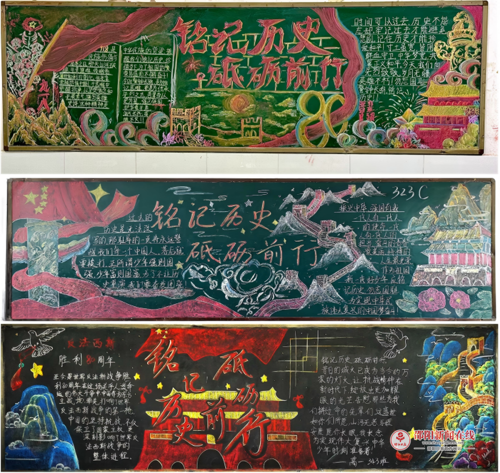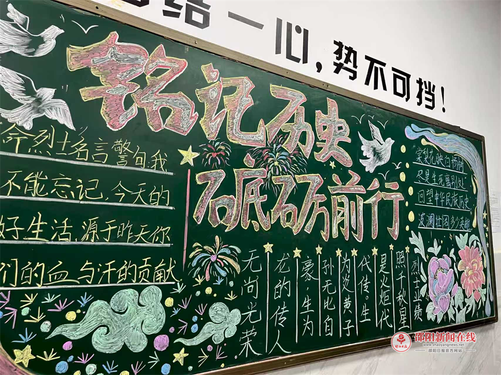 各班黑板上,斑斓色彩冲击视觉,澎湃激情震撼心灵。金光熠熠的五星红旗与五角星辉映主题,巍峨的长城与庄严的天安门诉说千年历史;振翅高飞的和平鸽与翱翔九州的凤凰,象征对美好未来的无限憧憬;坚毅的军人与嘹亮的号角,则唤醒那段烽火连天的峥嵘岁月。那铮铮作响的宣言、动人的英雄事迹以及那催人奋进的语录,都是历史的回响,是时代的注脚。学生们巧妙构思,将历史厚重与青春奋发熔于一炉,既有对过往最深切的缅怀,亦有对未来最炽热的展望。