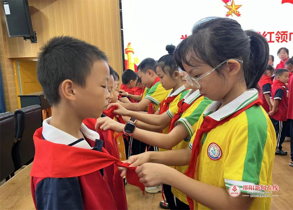 老队员们为新队员们郑重佩戴红领巾。当鲜艳的红领巾在新队员胸前飘扬时,他们的脸上洋溢着自豪与喜悦的笑容,这一抹红色也象征着责任与担当的传承。