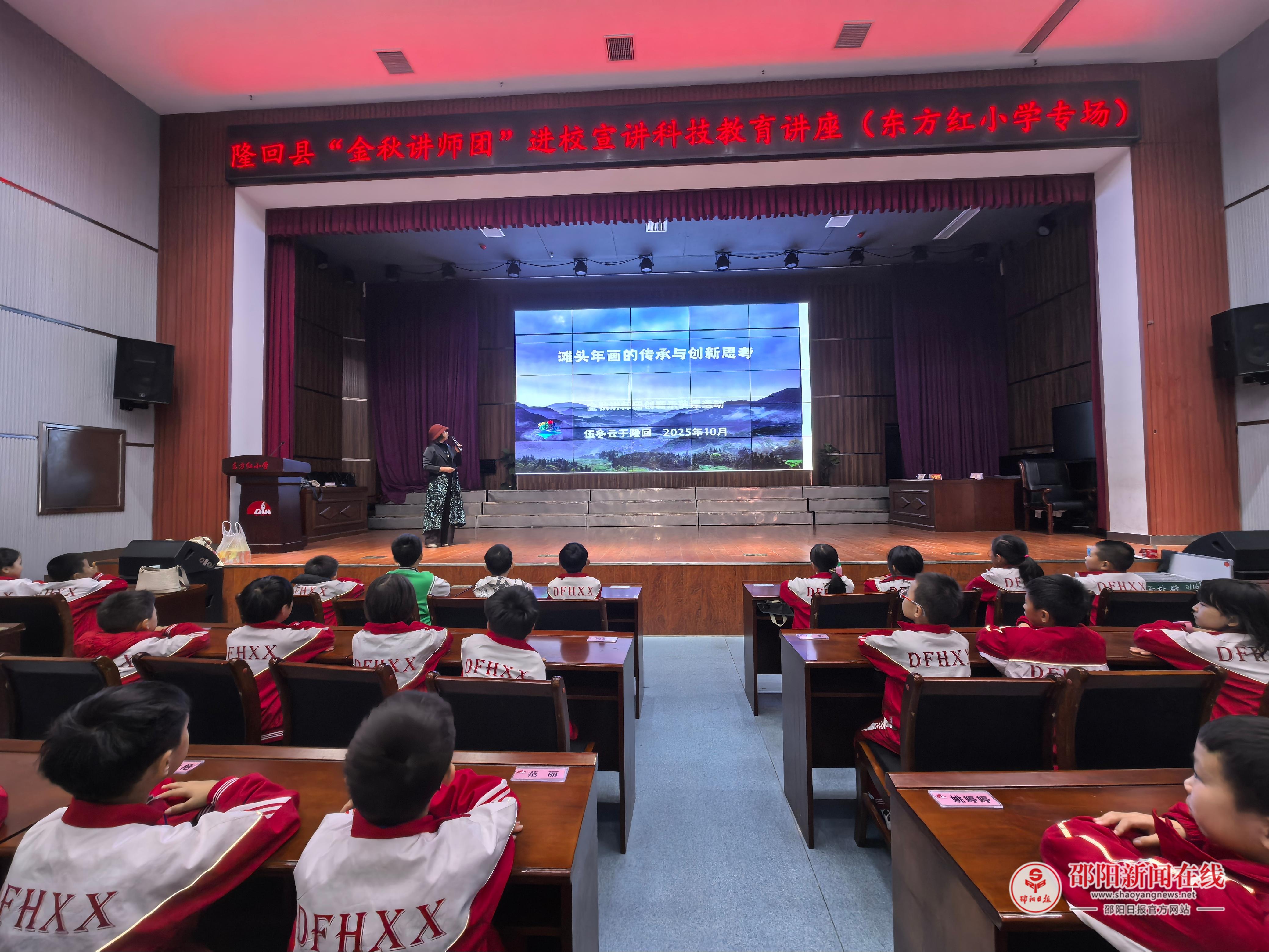邵阳日报·邵阳新闻在线讯(通讯员 黄业柳 刘雅婷 廖文胜)10月23日下午,隆回县东方红小学在多功能报告厅举办科技教育专题讲座。本次讲座特邀伍冬云老师主讲,以《滩头年画的传承与创新思考》为主题,四年级 352 班、353 班、354 班全体同学参与,在传统与科技的碰撞中感受文化魅力,激发创新热情。