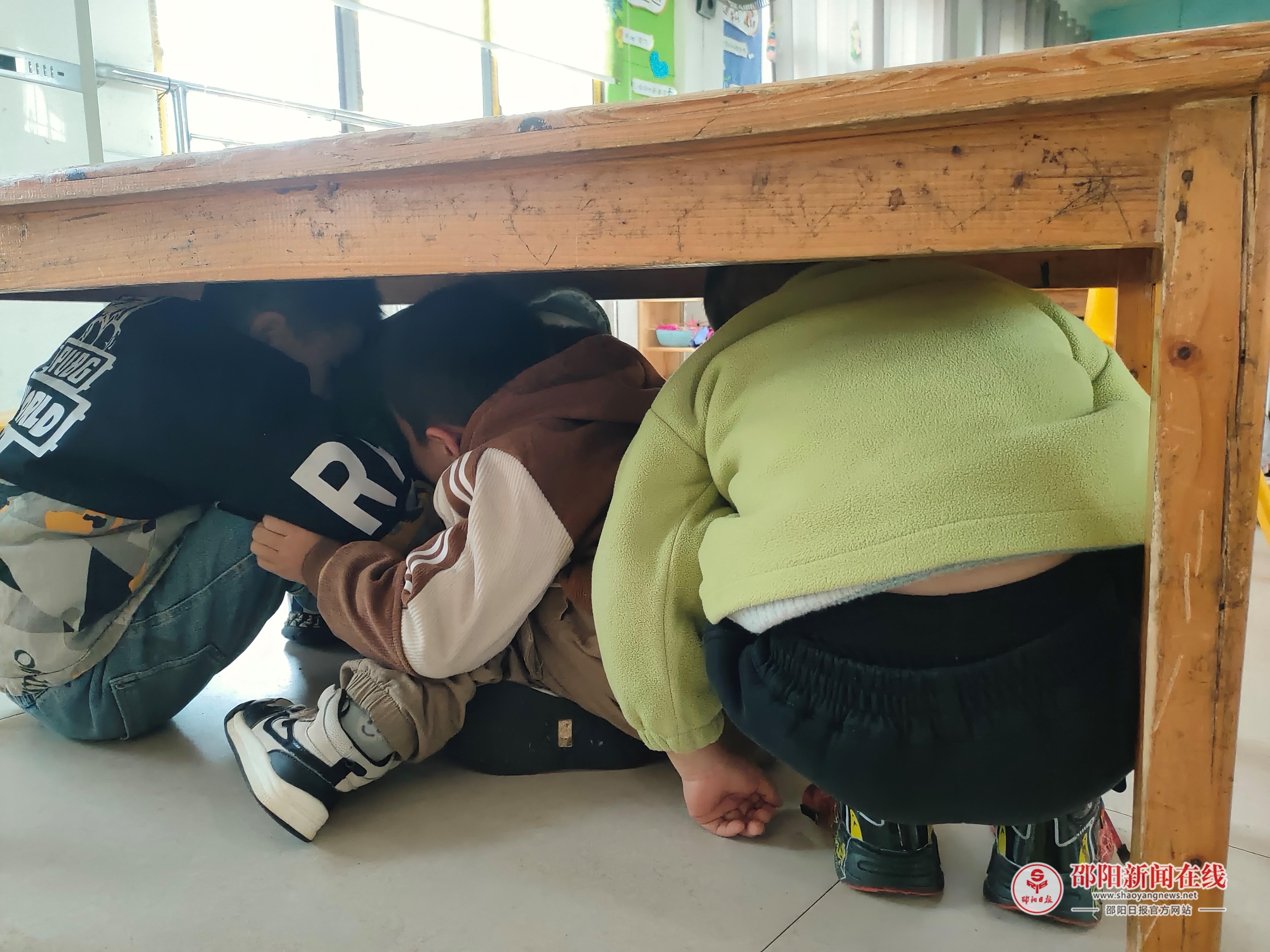 随着一阵急促的警报声响起,演练正式开始。进行日常活动的孩子们在老师的指挥下,迅速就近寻找安全的地方躲藏,他们有的钻到桌子底下,用书包、小枕头等物品保护好头部;有的快速躲到墙角,双手抱头,身体蜷缩。整个过程紧张有序,孩子们都能按照之前所学的方法进行正确避险。