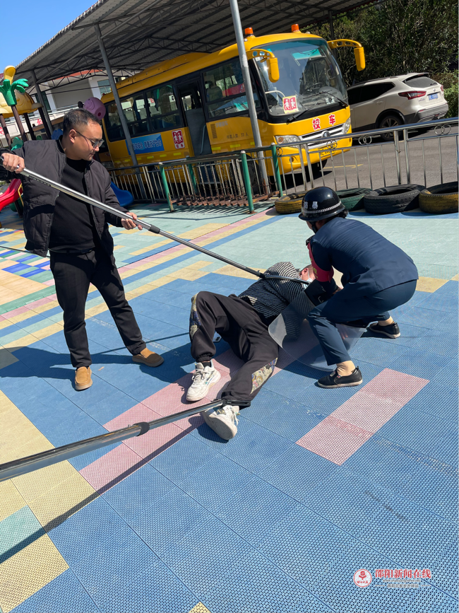 上午11点,演练正式开始。一名“歹徒”企图强行闯入幼儿园,保安人员发现后立即上前制止并启动一键报警系统,园内随即拉响应急警报。幼儿园应急小队迅速携带防卫器械,与保安协同配合,成功将“不法分子”控制。整个演练过程紧张有序,各部门衔接顺畅,师幼均能做到沉着应对、行动迅速,展现了良好的应急素质。