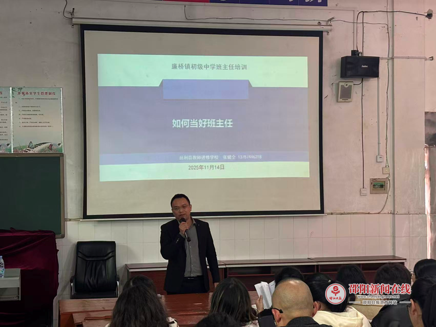邵阳日报·邵阳新闻在线讯(通讯员 邓宇薇 刘茜)为全面提升班主任队伍的专业素养与育人能力,近日,邵东市廉桥镇初级中学特邀知名教育专家张健全为全校教师带来了一场题为“如何当好班主任”的专题讲座。讲座围绕班主任的角色定位、工作意义与实践策略三大维度展开,内容翔实、案例生动,为全体教师提供了宝贵的经验借鉴与思想启发。